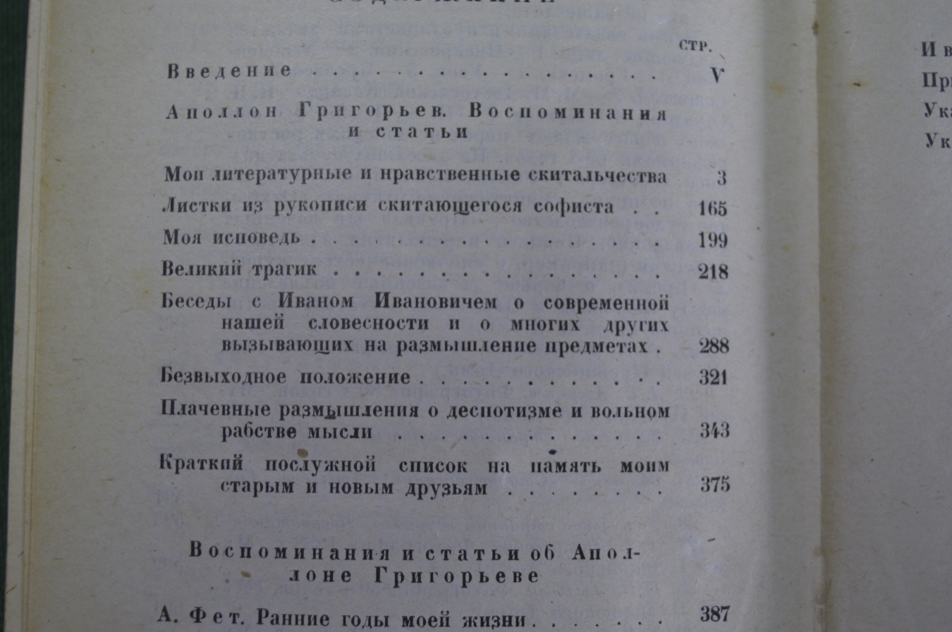 Настоящая книга — первая попытка собрать воспоминания А. Григорьева, написанные им незадолго до смерти — `Мои литературные нравственные скитальчества`, так и разбросанные в журналах, мемуарах и монографиях воспоминания самого А. Григорьева и об А. Григорьеве, воскрешающие жизнь этого большого русского критика. Среди воспоминаний об А. Григорьеве ценные свидетельства А. Фета и Н.Н. Страхова. Помещенная в качестве послесловия сопроводительная статья редактора содержит ряд биографических стихотворений А. Григорьева и изложение его автобиографических повестей. Книга богато иллюстрирована (портреты, автографы и др.). Значительная часть их взята из собрания Пушкинского дома.