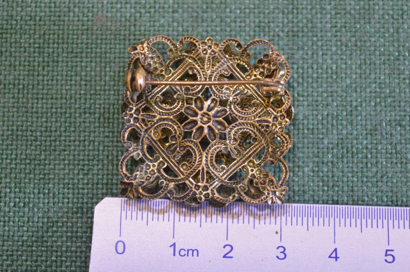 Брошь, брошка средняя, с красными камушками. Латунь.