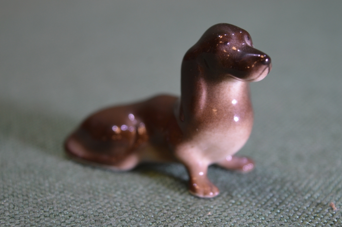 Фарфоровая статуэтка миниатюрная "Такса собака". Фарфор. ЛФЗ, СССР.