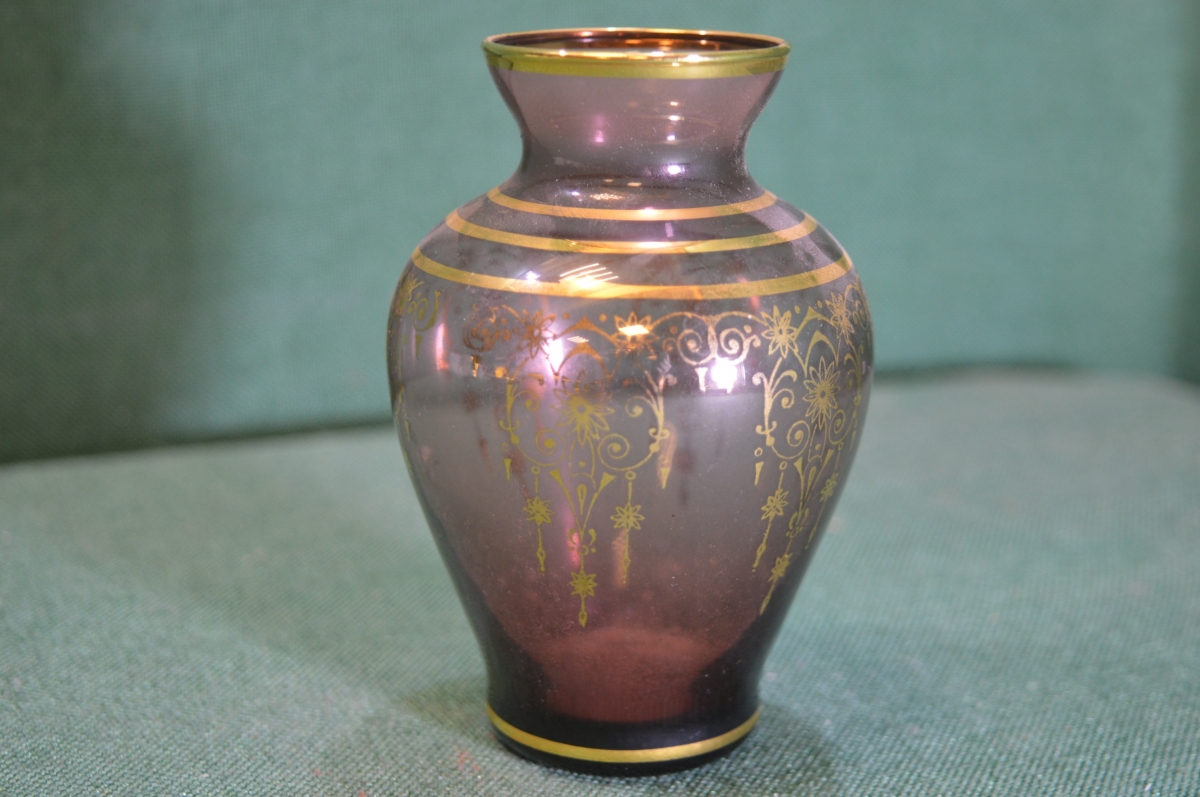 Ваза вазочка стеклянная "Модерн". Дымчатое стекло, позолота. Богемия. Bohemia. Чехословакия.