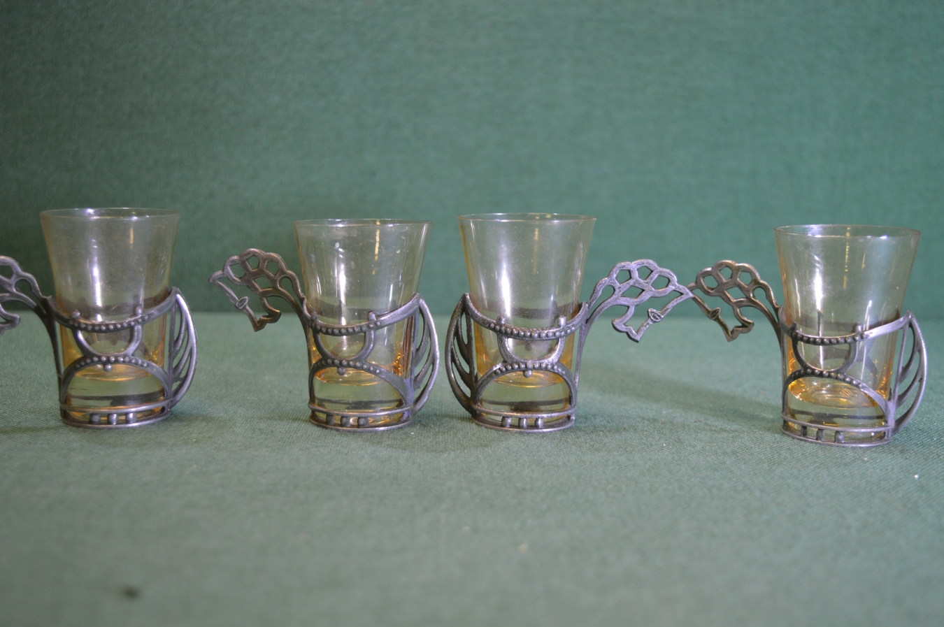 Рюмки, стопки с подрюмочниками (4 штуки). Конь, лошадиная голова. Стекло, металл.