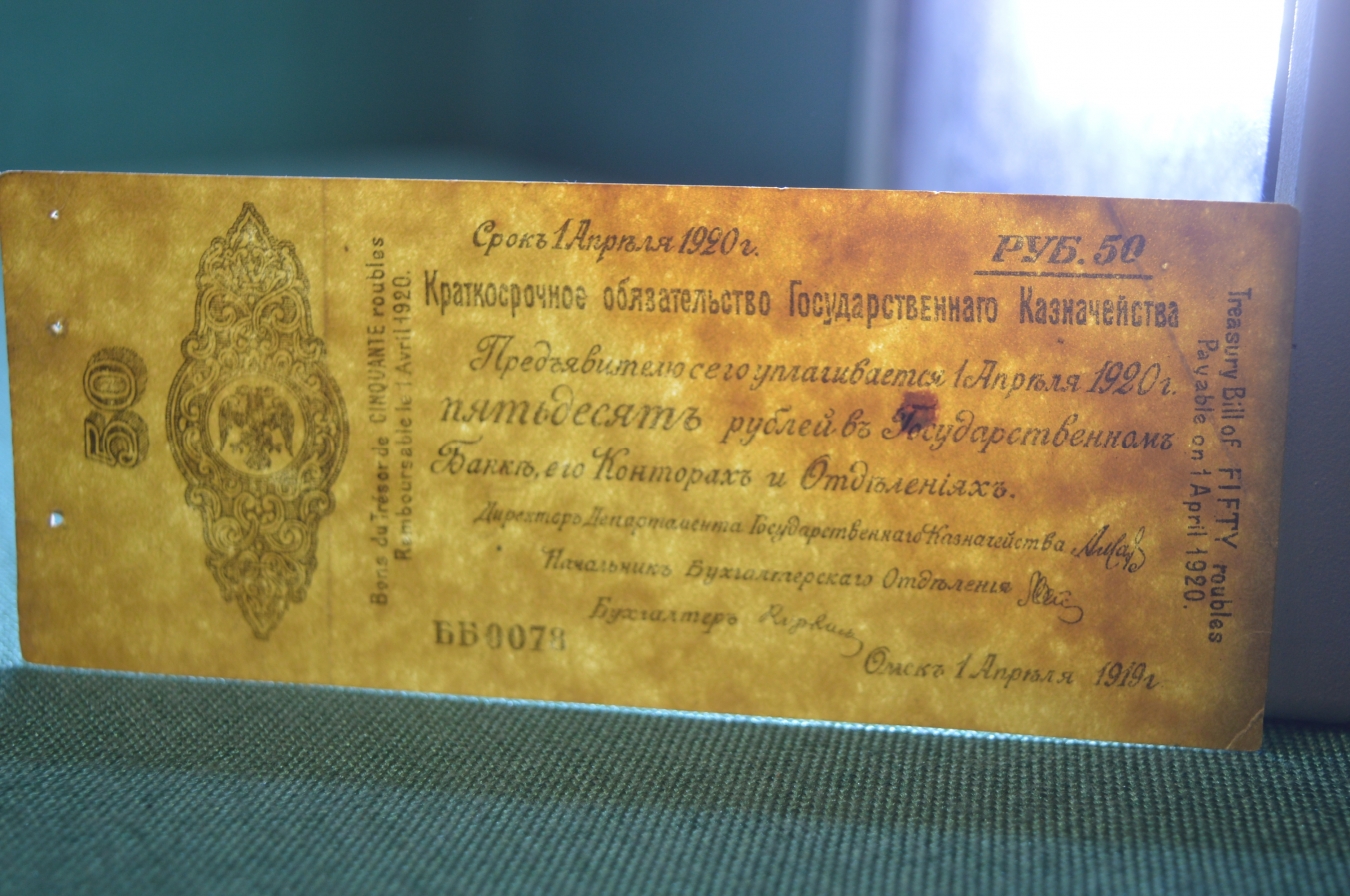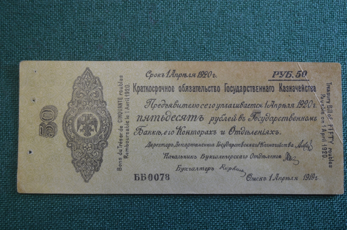 Бона, банкнота 50 рублей 1919 года. Пятьдесят. Омск, Колчак.
