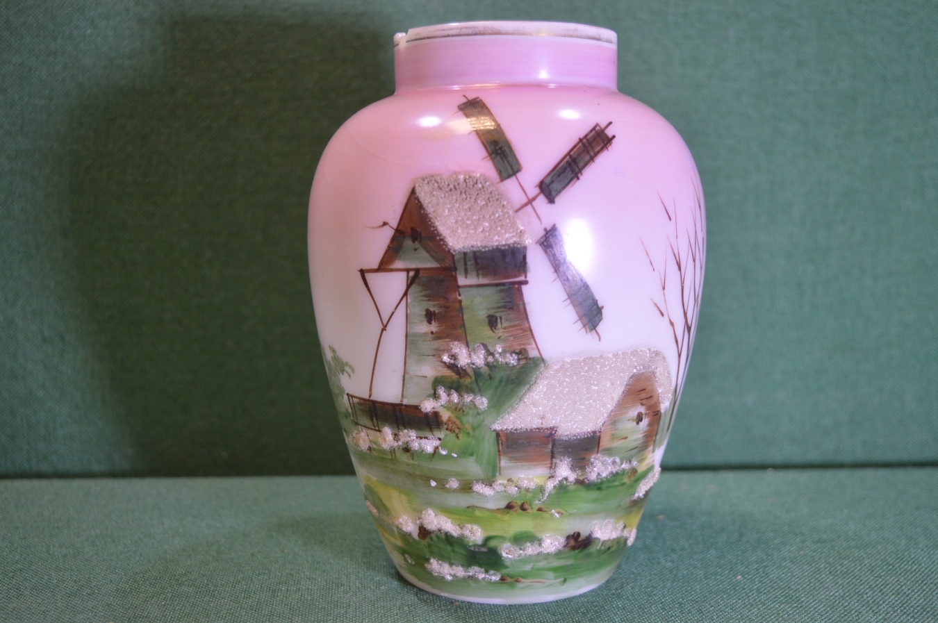 Чайница старинная, молочное стекло. Высота 17,5 см. Ветряная мельница. Пейзажная живопись. Инкрустация зернью.