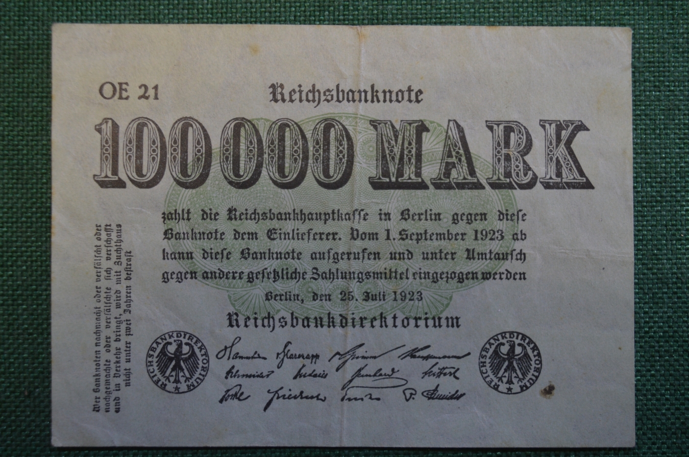 Бона, банкнота 100000 марок 1923 год. Сто тысяч. Рейхсбанкнота. Веймар, Германия.