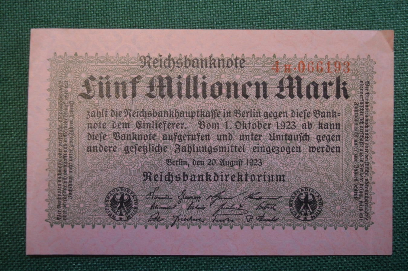 Бона, банкнота 5000000 марок 1923 год. Пять миллионов. Рейхсбанкнота. Веймар, Германия.