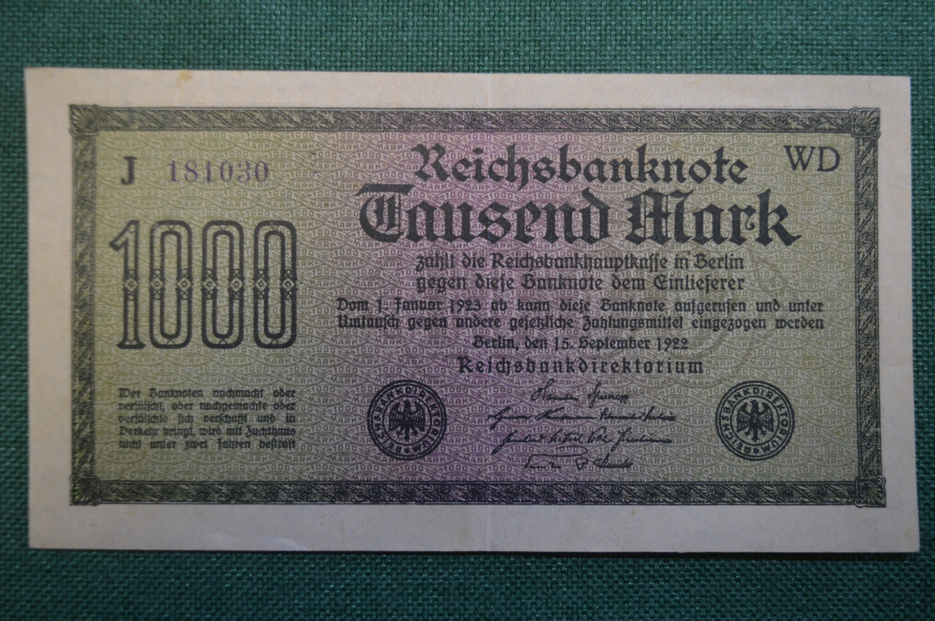 Бона, банкнота 1000 марок 1922 год. Одна тысяча. Рейхсбанкнота. Веймар, Германия.