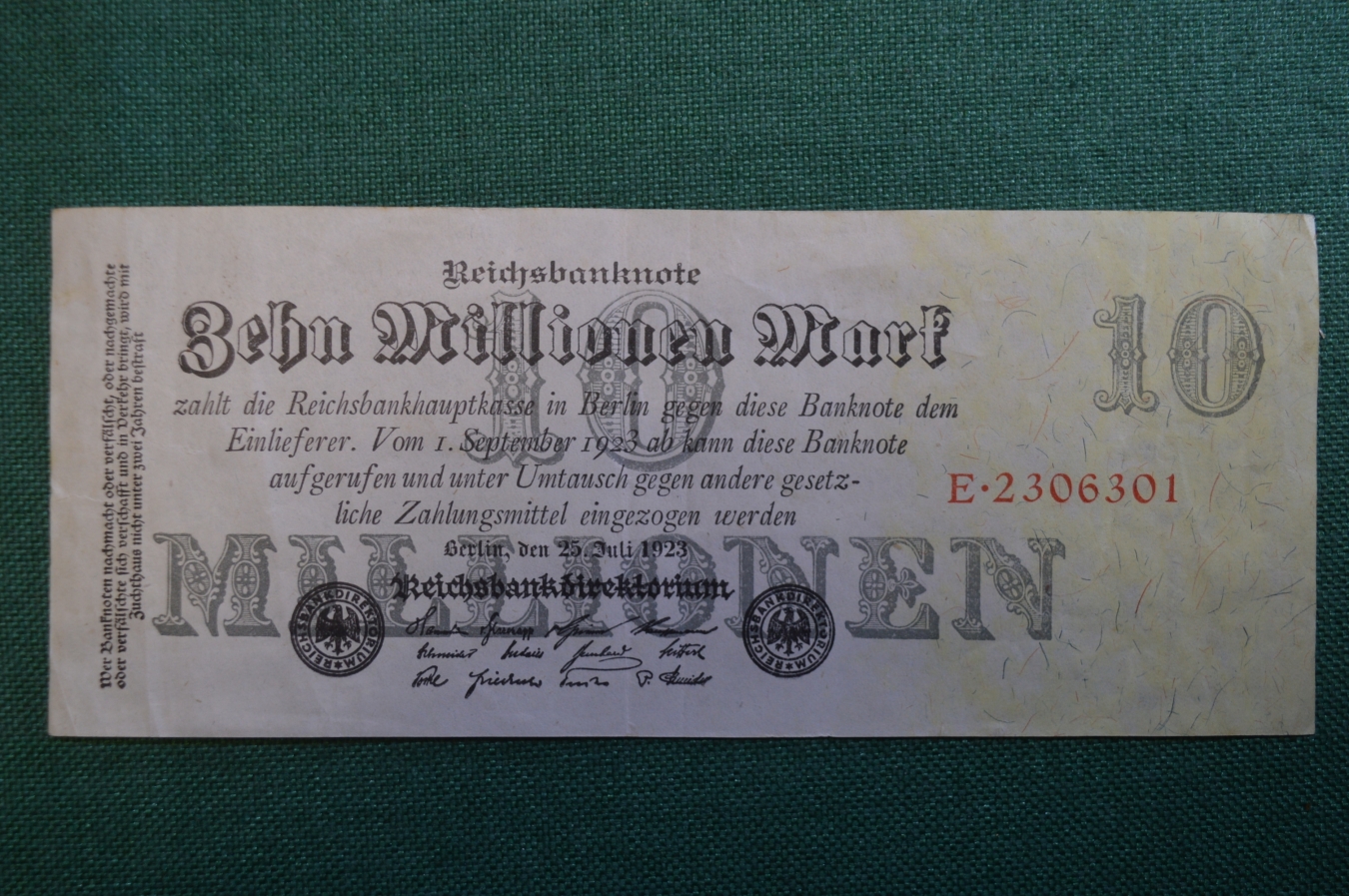Бона, банкнота 10000000 марок 1923 год. Десять миллионов. Рейхсбанкнота. Веймар, Германия.