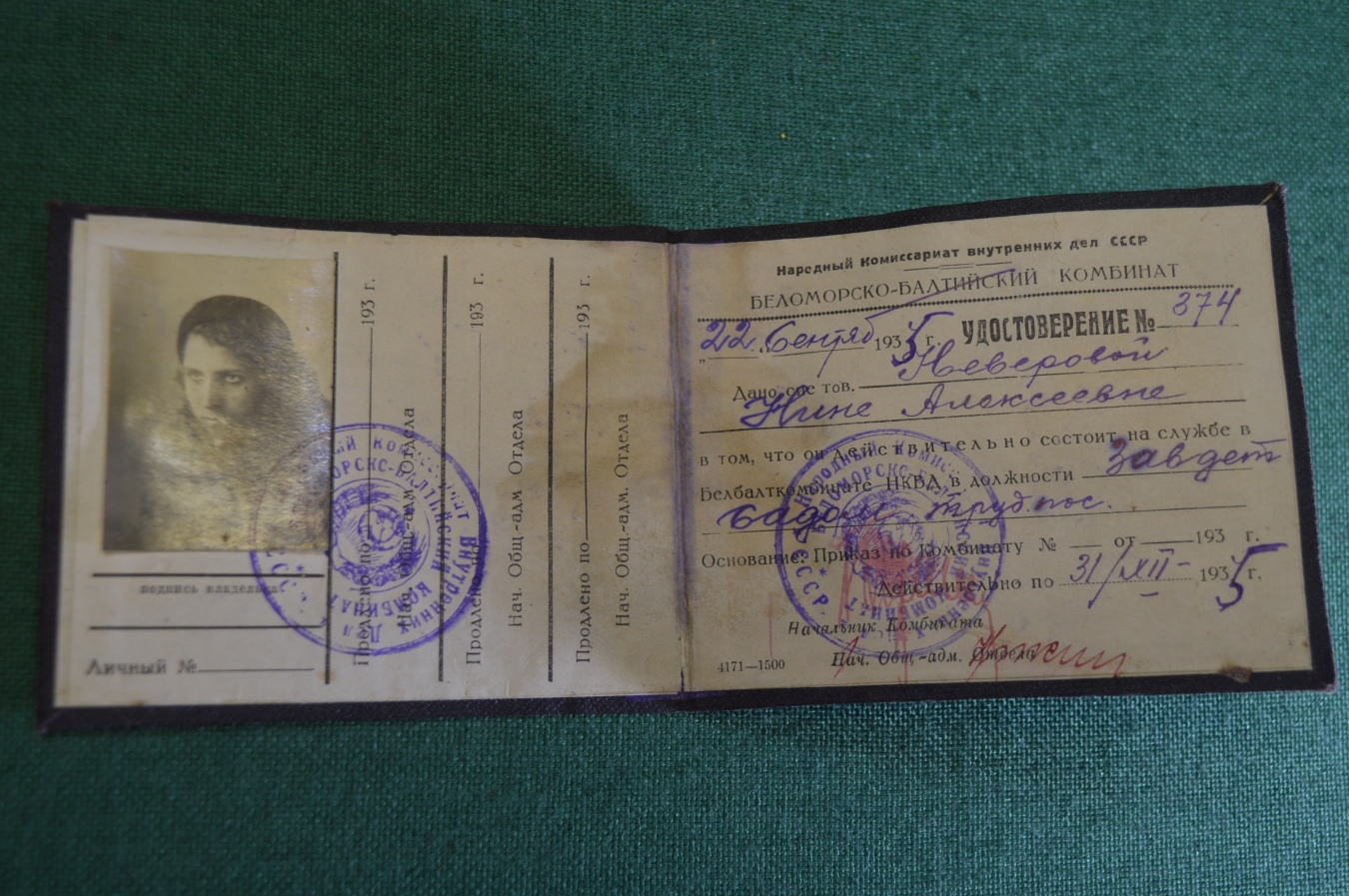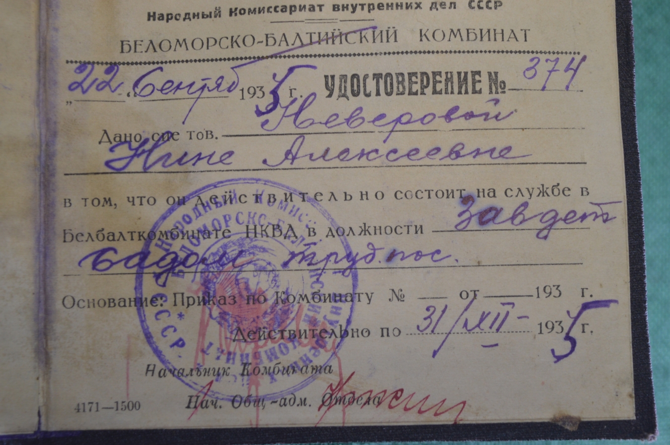 Удостоверение документ НКВД. Беломоро-Балтийский комбинат. СССР. 1935 год.