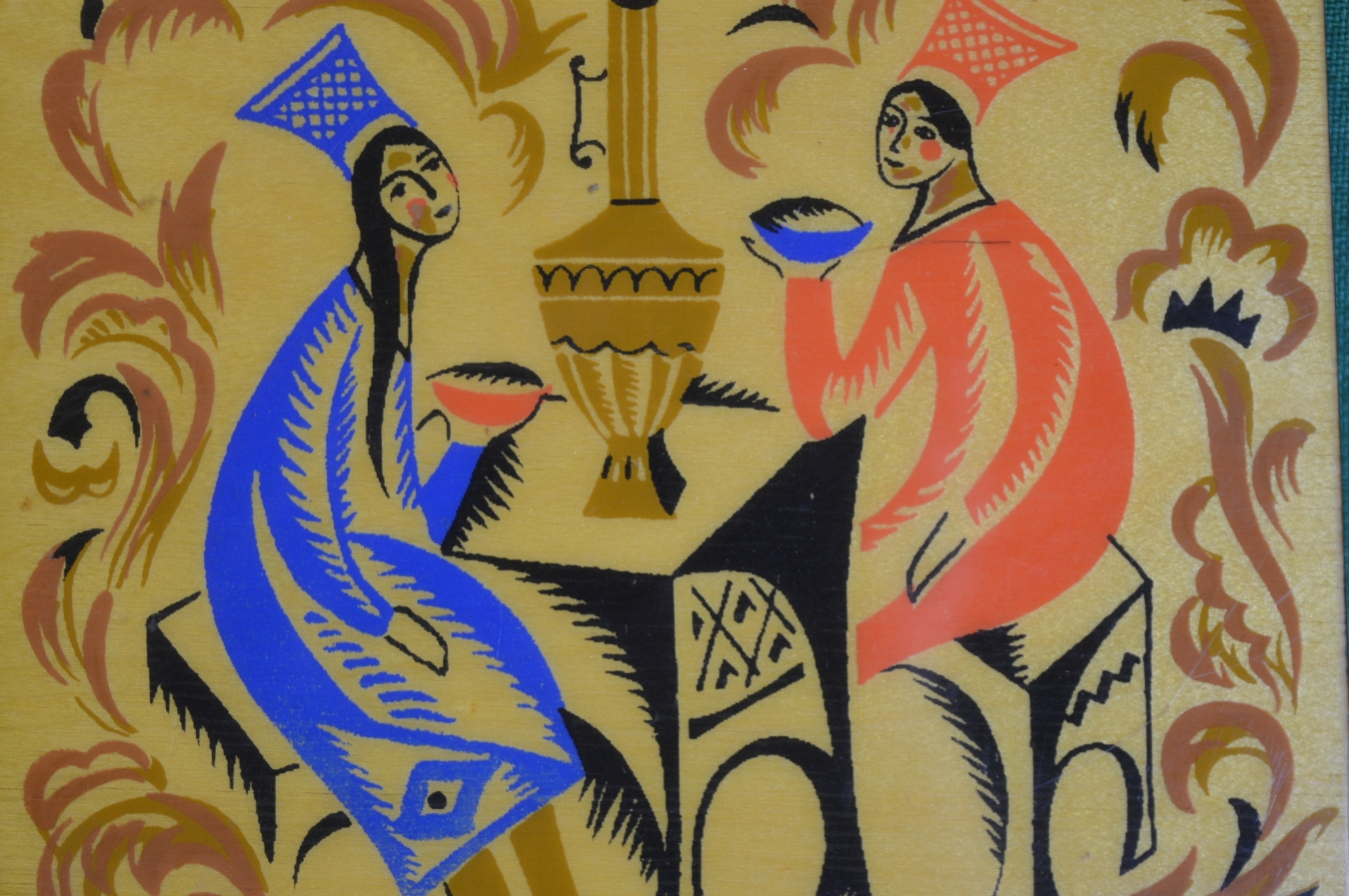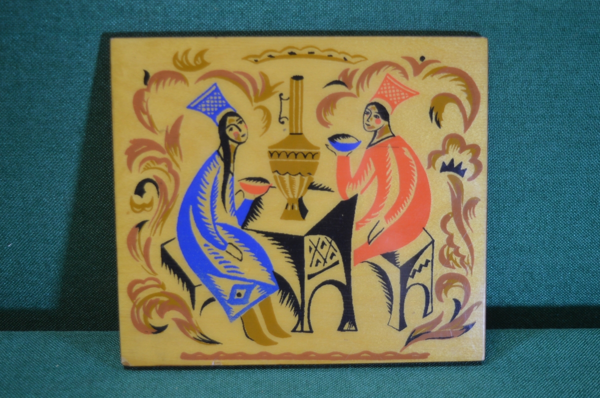 Панно настенное "Чаепитие". Дерево. Лак. Городецкая роспись. СССР.