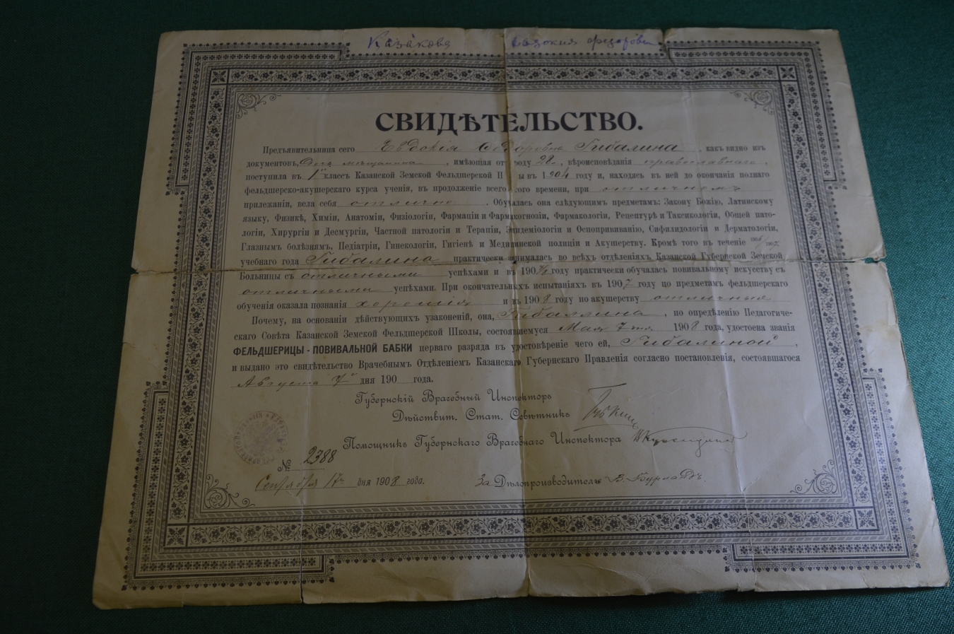 Свидетельство документ старинный. Повивальная бабка. Фельдшерица. Казань. Царская Россия. 1908 год.